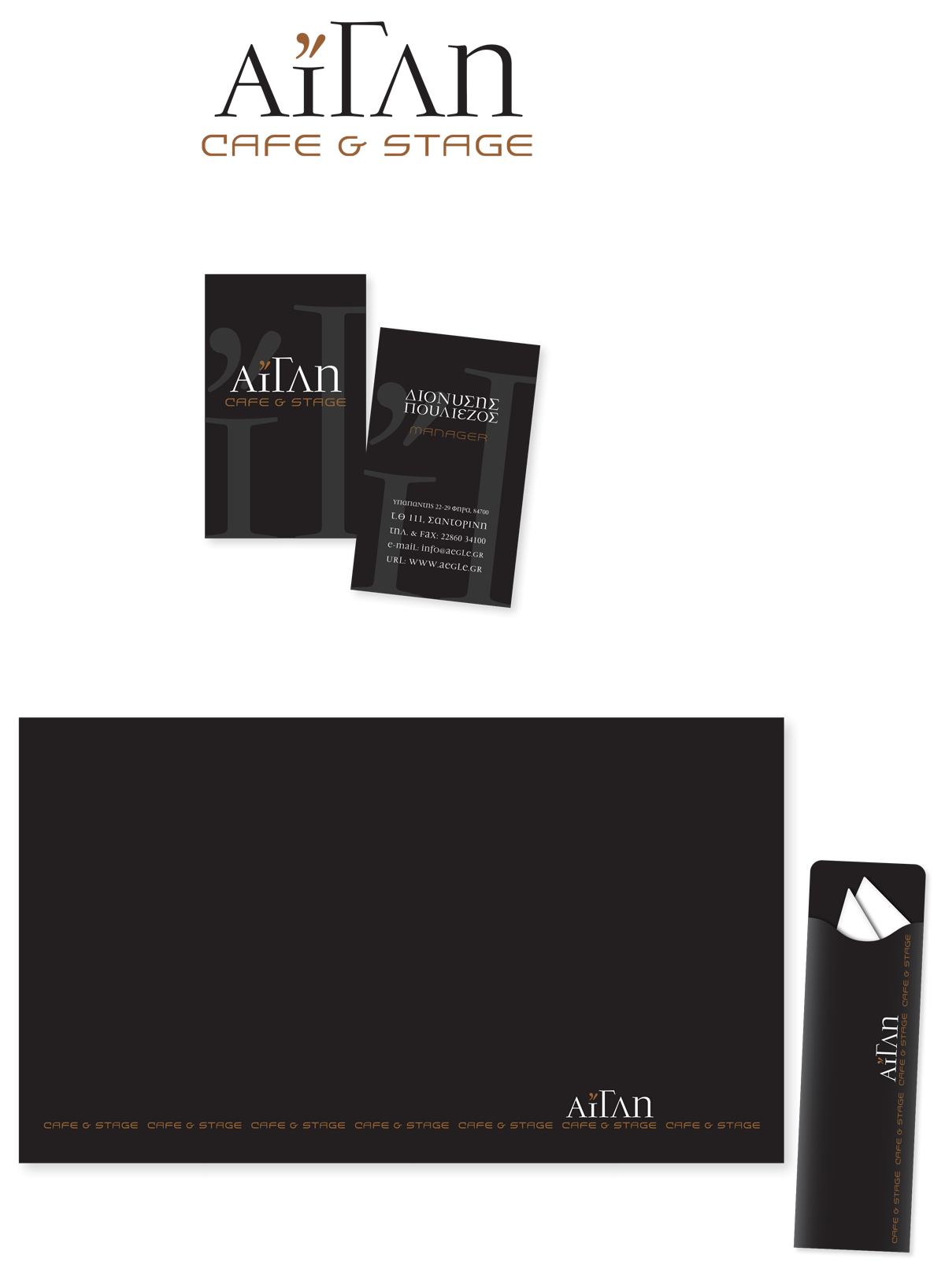 Αίγλη καφέ, Φηρά Σαντορίνης. Σχεδιασμός λογοτύπου, καρτών, σουπλά, πετσετοθήκης.