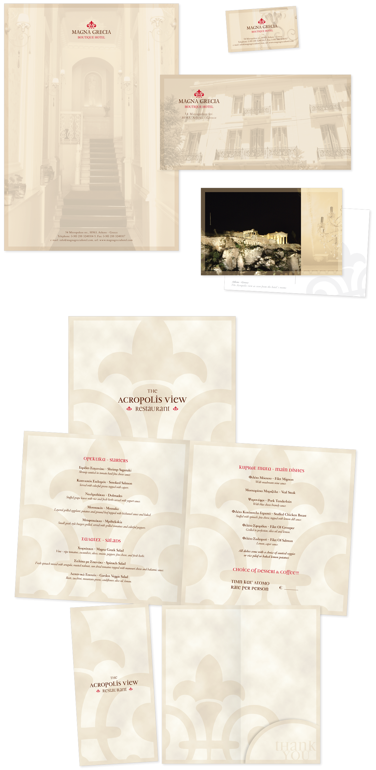 Σχεδιασμός εταιρικής ταυτότητας, καρτ ποστάλ και καταλόγου για το εστιατόριο του hotel. Αθήνα.